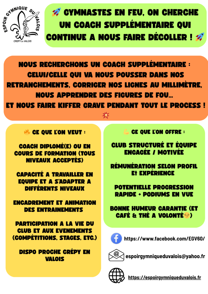 Contacte-nous en message privé ou par email : espoirgymniqueduvalois@yahoo.fr